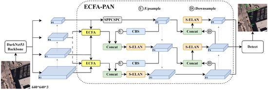 The whole pipeline of the proposed FFEDet. Utilization of DarkNet53 as the primary network architecture for feature extraction at four distinct levels. The extracted features are further enhanced using ECFA-PAN to improve their quality. Finally, we conduct object detection on three feature maps that contain rich semantic information at varying levels.