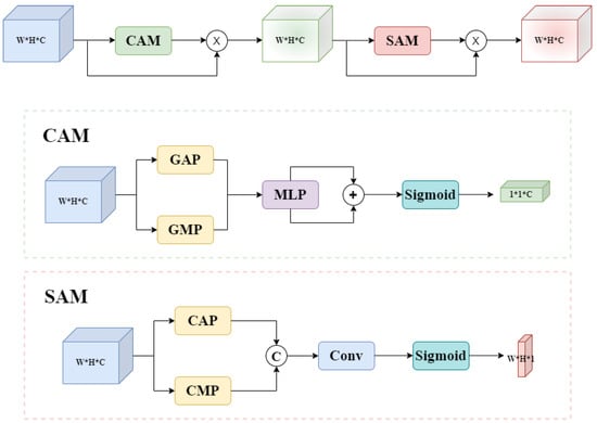 Composition of the CBAM structure. Channel attention module (CAM) and spatial attention module (SAM), which incorporate operations such as global average pooling (GAP) and global max pooling (GMP) along the spatial dimensions. Channel average pooling (CAP) and channel max pooling (CMP) are performed along the channel dimensions.
