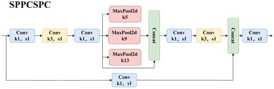 Composition of the SPPCSPC structure. The SPPCSPC module processes the input feature map through multi-scale pooling and convolution operations to generate higher-dimensional features, followed by multiple convolutions and concatenations, ultimately outputting the enhanced feature map.