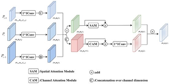 In object detection tasks, objects exhibit variations in size and shape across different scales. Consequently, cross-scale feature fusion plays a pivotal role in enhancing the understanding of objects within images and refining detection accuracy. By amalgamating features across different scales, the representational capacity of features is fortified, thereby fostering improved model generalization and robustness. Particularly noteworthy is the escalating depth of the model, exacerbating the challenge of fine-grained detail loss, especially pronounced in detecting small objects, thereby complicating the detection process. The efficient cross-scale information fusion attention (ECFA) module employs an efficient strategy for cross-scale feature fusion, effectively integrating multi-scale information through upsampling, downsampling, and concatenation of feature maps from different scales. This enables the model to dynamically adapt to the diverse scales inherent in object detection tasks. Attention mechanisms, initially successful in natural language processing, have now found broad application across various domains, including computer vision. These mechanisms aim to enhance model performance by guiding the model’s attention towards salient information, mitigating noise, and facilitating contextual modeling and information interaction across different scales of feature maps. Consequently, the ECFA module utilizes attention mechanisms for cross-scale feature fusion and interaction, in conjunction with SAM and CAM, to capture crucial spatial and channel information, thereby amplifying the model’s discriminative capability and accuracy. Figure 4 illustrates the structure of ECFA. Firstly, we independently apply convolutional layers to feature maps (, , ), (, , ), and (, , ) obtained from three adjacent scale levels. Subsequently, we perform downsampling and upsampling operations on and , resulting in three feature maps of equal shape: (, , C), (, , C), and (, , C). Next, we perform element-wise addition and channel-wise concatenation on these feature maps, obtaining feature maps of sizes (, , C) and (, , ). Then, we apply spatial attention and channel attention operations separately. Finally, we combine the results using weighted fusion to extract more comprehensive object information. This module enhances the representation capability for small objects by effectively focusing on different feature maps. The spatial and channel attention operations can be mathematically represented as follows: