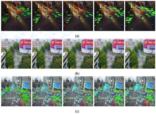 Qualitative examples of small object scene detection on VisDrone-DET2021. (a) Qualitative example of image 1. (b) Qualitative example of image 2. (c) Qualitative example of image 3. Each row displays, from left to right, the detection results consisting of the ground truth bounding boxes, the YOLOv5 algorithm, the YOLOv7 algorithm, the YOLOv8 algorithm, and our algorithm.