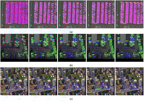 Qualitative examples of small object scene detection on DOTAv1.0. (a) Qualitative example of image 1. (b) Qualitative example of image 2. (c) Qualitative example of image 3. Each row displays, from left to right, the detection results consisting of the ground truth bounding boxes, the YOLOv5 algorithm, the YOLOv7 algorithm, the YOLOv8 algorithm, and our algorithm.
