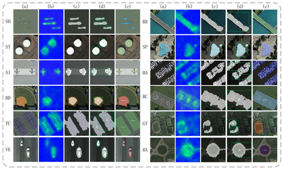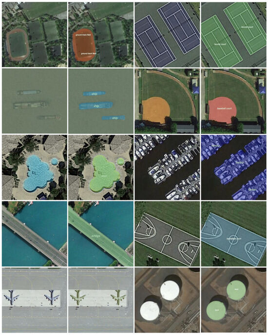 In this paper, we do not train any parameters in the SDM and SAM. Due to the lack of information about vehicle sizes in the remote sensing classification datasets, we merged ‘small-vehicle’ and ‘large-vehicle’ as one category, i.e., ‘vehicle’, during testing on iSAID. Additionally, since the “helicopter” and “soccer ball field” categories do not exist in the classification dataset, we did not generate pseudo-labels for them. Finally, we collected 9300 RSIs. The total pseudo-label categories and their abbreviations annotated in this paper are: AI-airplane, SH-ship, ST-storage tank, BD-baseball diamond, TC-tennis court, BC-basketball court, RA-roundabout, PL-playground (ground track field), SP-swimming pool, HA-harbor, BR-bridge, and VE-vehicle. Mask R-CNN [33], Cascade R-CNN [34], and Mask2Former [34] were used as the baseline to evaluate our method. Eight Tesla V100 GPUs were used to generate pseudo-labels, which took approximately 96 h.