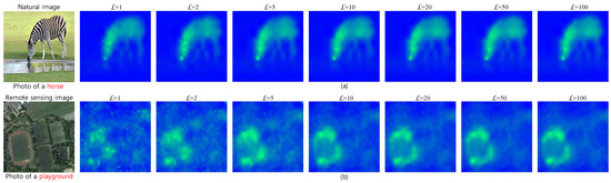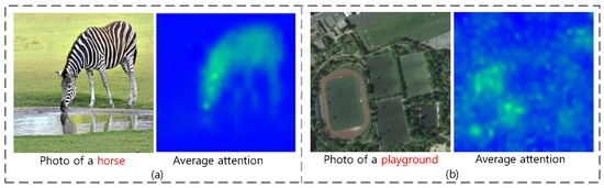 Figure 3a indicates that the highlighted regions in the cross-attention map correlate with the regions where that input token is presented. However, the maps are significantly noisy. Figure 4 compares the cross-attention maps between natural and remote-sensing images. Figure 4a shows a precise attention map for the ‘horse’ region. On the contrary, the attention map in Figure 4b for an RSI only roughly indicates the ‘playground’ region, showing a very weak correlation with regions a human would pick out as meaningful. Therefore, it is necessary to denoise the cross-attention maps in SDM before using them to localize remote sensing objects. However, the noise points tend to be localized and demonstrate high randomness in their distribution. Hence, achieving precise removal of these noise points poses a significant challenge.