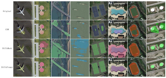 Figure 9 visualizes the output results of two advanced AIA methods and our DiffuPrompter. CAM originates from classification models and focuses more on discriminative regions while neglecting details. Consequently, the masks it generates often fail to cover the object entirely. DiffuMask, a recently proposed advanced algorithm, also leverages diffusion models to generate pseudo-masks for objects. It optimizes attention maps in U-Net through noise learning and uses them as pseudo-labels. However, DiffuMask is designed to generate pseudo-labels for synthetic images, which limits its annotation ability for authentic images. From Figure 9, it is evident that the optimized attention map is still easily disturbed by the complex background in RSIs. Moreover, the additional training process significantly increases its annotation cost compared to DiffuPrompter. In contrast, the proposed DiffuPrompter can accurately locate and label masks for target objects without training.