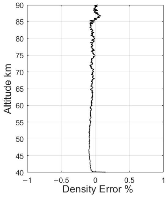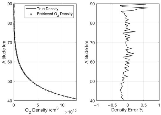The time interval is reduced to 0.02 s, corresponding to a vertical interval of about 62 m. As shown in Figure 3, the retrieval error is reduced at this time. The average retrieval error of the oxygen density is less than 0.1% within altitudes of 40–90 km.