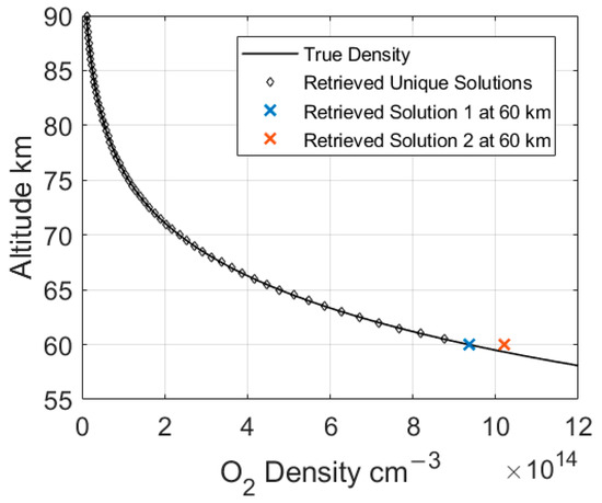 As shown in Figure 6a, the two curves have only one intersection for the altitude of 80 km. As shown in Figure 6b, there is also only one intersection for the two curves, but the two curves tend to overlap. In Figure 6c, for the altitude of 60 km, two intersections occur, corresponding to oxygen densities of 9.4 × 1014 cm−3 and 1.1 × 1015 cm−3. These two values are also solutions 1 and 2 in Figure 5. The corresponding temperatures are 240.0 K and 206.3 K, respectively. This means that, in the case of a vertical interval of 200 m, at the altitude of 60 km, there are two solutions that both satisfy the four Equations, (11)–(14), simultaneously, and it is difficult to tell which of the solutions is the true one.