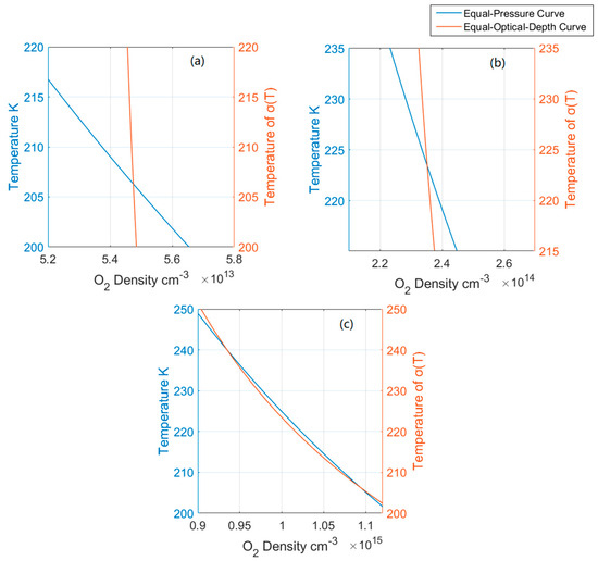 In order to investigate the mechanism of this problem, the equal-pressure curve and the equal-optical-depth curve are analyzed at altitudes of 80 km, 70 km, and 60 km, respectively. From hydrostatic equilibrium Equation (12), the pressure of each layer is determined by the state of the upper atmosphere, and then, with ideal gas state Equation (13), the equal-pressure curve (density–temperature) can be obtained. The pressures are the same at any point on this curve; the transmission or optical depth of each layer is determined by simulation or detection, and the equal-optical-depth curve (density–cross-section) can be obtained from Equation (14). Any point on this curve corresponds to the same transmission or optical depth. In addition, the vertical coordinate σ(T) of the equal-optical-depth curve is an independent variable of temperature; therefore, the two curves can be presented in the same coordinate system, as shown in Figure 6.