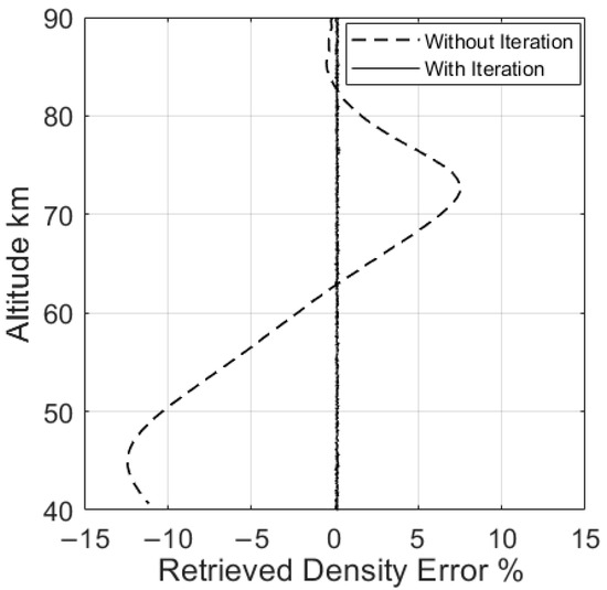 As in the example shown in Figure 4a, the forward and retrieval temperatures are still different. The vertical interval is set to 2 m for both non-iterative and iterative retrieval. The error curves for both retrieval cases are provided. As shown in Figure 8, it can be seen that the introduction of the iteration method greatly improves the accuracy of the retrieval. When the iteration is not implemented, the error comes from the deviation of the a priori temperature. After the iteration, the result accurately approximates the true atmospheric density.
