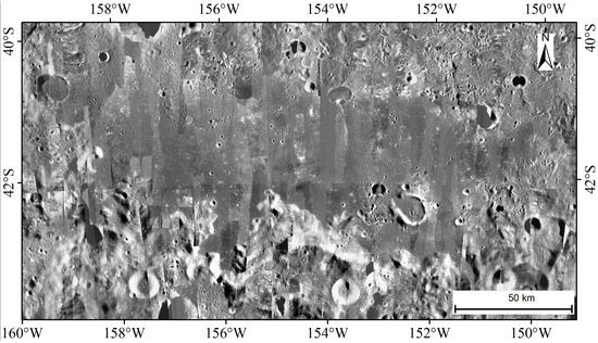 A high-resolution DOM mosaic of the landing area was generated using 743 LROC NAC images as a base map to extract and measure craters in the CE-6 landing area (Figure 1). The LROC NAC images covered most of the lunar surface with a horizontal resolution of 0.5–2 m and were the highest-resolution orbiter images currently available in the pre-selected landing area [18]. A method for large-area DOM generation was proposed and used to produce the high-resolution orthophoto mosaic of the CE-5 landing area [19] and was also used in this research. According to this method, 743 NAC images were selected first, and the Planetary Data System (PDS) experiment data record (EDR) files of them were downloaded from the PDS Geosciences Node Lunar Orbital Data Explorer website. Next, the SPICE kernels were attached, and radiometric corrections were performed for each image using the Integrated System for Imagers and Spectrometers (ISIS) software (v7.2.0). The planar block adjustment was then utilized to improve the relative positional consistencies of the LROC NAC images of the sub-areas to subpixel level and simultaneously align the NAC images to the control source (SLDEM2015). Subsequently, TPS (Thin Plate Spline)-based image registration was used to reduce geometric inconsistencies between the adjacent sub-area DOM mosaics, ensuring that the final DOM was seamlessly mosaicked over the entire area. Finally, a geometrically seamless DOM mosaic was produced, covering 149°–160° west longitude and 39.7°–44.1° south latitude with a resolution of 3 m/pixel. The detailed mapping method can be found in [19].