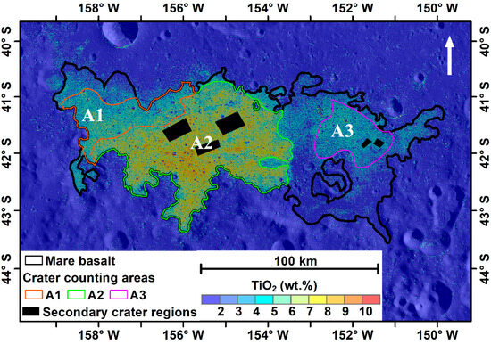By inputting impact crater extraction results into the CraterStats software, the absolute model ages (AMAs) of the A1, A2, and A3 basalt units were Ga, Ga, and Ga, respectively (Figure 9a–c). The AMAs of A1 and A2 were within each other’s uncertainty range, suggesting there might be either two basalt flooding events or only one flooding event, but the surface of A1 was masked/contaminated by materials with low TiO2 content (e.g., ejecta) that resulted in a decrease in TiO2 abundance. If the latter was the case, dating on the A1 + A2 unit would indicate the flooding happened around Ga (Figure 9d).