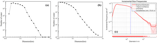 The (a) incremental and (b) cumulative size–frequency distributions of craters in the crater catalogue with the diameter internal of D in a log-log plot. Note that the diameter axis is the crater median in each bin. (c) The incremental size–frequency distribution established by robust kernel density estimation [33].