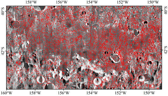 In this crater catalogue of the whole area, 38,471 possible secondary crater clusters were identified and eliminated by the easily applicable criteria of irregular shape, clustered distribution, and auxiliary information of shallow depth. In the original crater catalogue, there were 511,484 craters with diameters larger than 30 m, 15,575 craters with diameters larger than 200 m, and 456 craters with diameters larger than 1 km. The mapping results showing craters with diameters ≥200 m are illustrated in Figure 5. After secondary crater elimination, there were 484,410 craters with diameters larger than 30 m, 14,142 craters with diameters larger than 200 m, and 415 craters with diameters larger than 1 km.