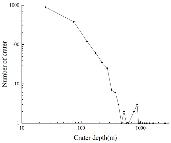 The estimation of crater depth was based on SLDEM2015, which is described in Section 2.2. Considering the grid size of SLDEM2015, only craters with diameters larger than 480 m were considered for depth estimation. Craters with depths larger than 12 m were utilized for subsequent analysis, considering the vertical accuracy of SLDEM2015 to be 3–4 m. A total of 1547 craters were ultimately measured for depth, with depths ranging from 12.1 to 2583.8 m. The majority of craters (94.2%) had depths less than 200 m. Six craters were deeper than 1 km, and nearly all of these craters were located in the geological units of the highlands. Figure 7 shows the crater depth distribution with a depth interval of 50 m.