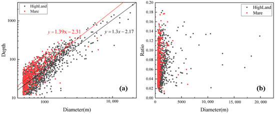 The relationships between the crater diameter and (a) the crater depth (in a log-log plot) and (b) the d-D ratio. The results for mare craters are shown in red, while the results for highland are shown in black.