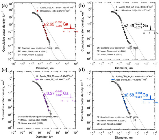 AMAs of the crater dating areas: (a) A1; (b) A2; (c) A3; (d) A1 + A2. The standard lunar crater equilibrium line is from [37], the PF is from [5], and the CF is from [5].