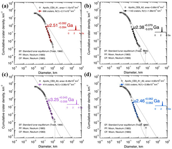 Ref. [10] also carried out crater dating on the basalt units of the CE-6 landing area, with approximately similar dating areas of A2 and A3. They used the classic chronology system, i.e., [5]. If the chronology system from [5] was used for dating in this study, the AMAs of the A1, A2, A3, and A1 + A2 basalt units were Ga, Ga, Ga, and Ga, respectively (Figure 10a–c). Compared with their dating results (i.e., Ga for the F_A unit and for the L_A unit), the AMA of the A2 unit was about the same in both studies, while the AMA of the A3 unit estimated in this study was younger than that of [10]. The difference might be because the dating regions and data sources for crater counting were not completely consistent. Overall, as we mapped craters based on higher-resolution DOM and used more craters in dating the surface units after eliminating secondary craters, our surface dating results should be more reliable.