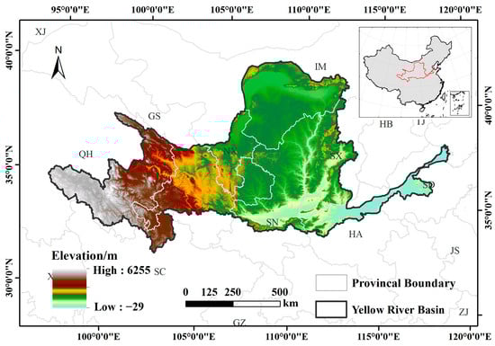 The YB in the northwest of China covers Qinghai (QH), Sichuan (SC), Gansu (GS), Ningxia (NX), Inner Mongolia (IM), Shaanxi (SN), Shanxi (SX), Henan (HA) and Shandong (SD) provinces (Figure 1) and lies between the latitudes 32°10′N and 41°50′N and the longitudes 95°53′E and 119°05E. The YB consists of four geomorphological units, with varying temperatures and precipitation across the landscape. The majority of areas in the upper and middle sections of the YB are situated in dry and semi-dry regions, with ecosystems that are delicate and easily affected. This is especially the case in central and the southern IM, northern SN, southeastern GS, and southern NX provinces [24].