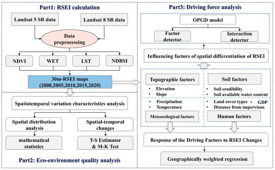 This study’s framework comprised three parts (Figure 2). The first part was the calculation of the RSEI. The second part evaluated the EEQ of the study area through the spatial distribution analysis and spatial–temporal change analysis of the RSEI. The third part employed the OPDG model and GWR model to explore the factors influencing the EEQ in the YB.