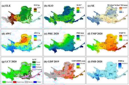 In this paper, elevation (ELE), slope (SLO), soil erodibility (SE), soil available water content (AWC), annual precipitation (PRE), annual mean temperature (TMP), land cover types (LCT), GDP and distance from impervious surfaces (IMD) were selected. The spatial distribution of driving factors is shown in Figure 3. These nine factors were divided into four categories based on their content and attributes: (1) topographic factors (ELE and SLO); (2) soil factors (SE and AWC); (3) meteorological factors (PRE and TMP); and (4) human factors (LCT, GDP, and IMD). Considering the area of YB and satisfying the requirements of spatial heterogeneity, a 10 km × 10 km grid was generated. LCT data were obtained for the types that occupy the largest proportion in each grid, and other factors were calculated for the grid mean data.