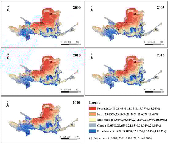 The RSEI was categorized into five classes via the Jenks method, namely Poor, Fair, Moderate, Good, and Excellent. The RSEI classes were lower in the north and higher in the south (Figure 4). The Poor and Fair entries were concentrated in the upper and middle reaches of the YB, including Lanzhou and Baiyin in GS, IM, and the arid zone of central NX. The Moderate and Good entries were primarily found in the Yellow River’s origin areas and the YB’s lower reaches. The Excellent entries were primarily found in the Ruoergai-Maqu Ecological Function Reserve, the Qilian Mountains, and the Qinling Mountains.