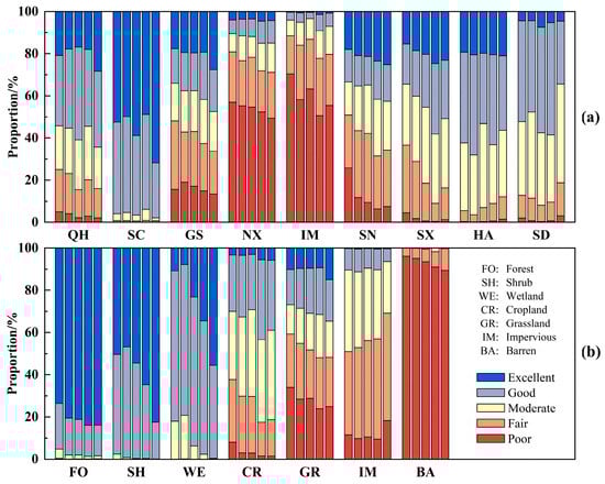 At both the provincial and the land cover levels, the RSEI classes in the YB had regional characteristics (Figure 5a). The ecological condition of NX and IM was not good, with more than 60% of this area being categorized as Poor or Fair. The ecological condition of other provinces was higher, with the majority of regions categorized as Moderate and above (an area exceeding 70% of the whole). SC had the highest categorized ecological condition, with more than 90% of its total area classified as Good or Excellent. The distribution of RSEI classes varied across different land cover types (Figure 5b). The distribution of RSEI classes in forestland, shrubland, and wetland was mainly Good and Excellent, while barren land was almost entirely Poor. The ecological condition of cropland, grassland, and impervious land was dominated by multiple RSEI classes.
