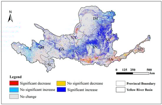 Table 4 shows the RSEI trend change types in the provinces of the YB from 2000 to 2020. Throughout this timeframe, aside from HA and SD, the ratio of land improvement areas in the other seven provinces exceeded that of the land degradation area. The change ratio of land ecological status in the nine provinces in descending order was SX > SN > SD > HA > GS > NX > IM > QH > SC. SX and SN showed the most obvious improvement in EEQ, with area improvement rates reaching 35.93% and 31.45%, respectively—far greater than the land degradation area. The degradation of EEQ was most obvious in HA and SD, with area degradation ratios of 17.76% and 18.27%, respectively.