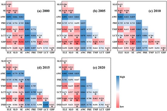 The explanatory power of driving factors was as follows: AWC > PRE > IMD > LCT > SLO > TMP > ELE > GDP > SE (Table 6). AWC, PRE, and IMD were the dominant factors of RSEI, with 5-year mean q values of 0.787, 0.614, and 0.421, respectively. LCT, SLO, TMP, and ELE also have an important impact on EEQ, with five-year average q values of 0.330, 0.314, 0.297, and 0.233, respectively. The explanatory power of GDP and SE is relatively low.