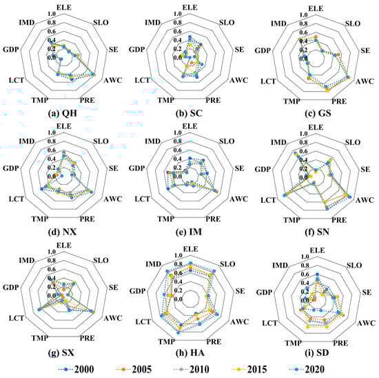 Figure 8 shows the factor detection results of provinces in the YB. In QH, SC, and GS, natural factors are the main influencing factors. In NX, IM, SN, SX, HA, and SD, both natural and human factors show a strong influence. The interactive detection results show that the factors selected in this study are reasonable, and the interaction between factors can explain the spatial differentiation characteristics of RSEI well (Table 7).