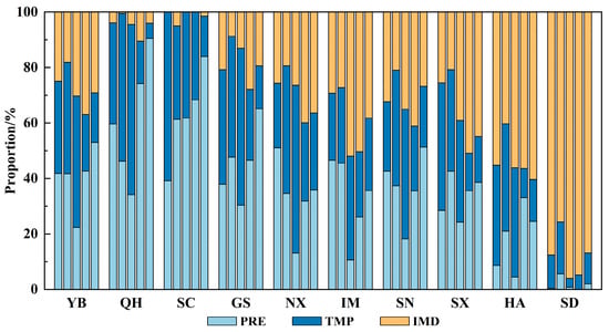 According to the number of positive and negative regression coefficients, PRE and TMP have a slight positive influence on RSEI change in the YB, while IMD has a significant positive influence on RSEI change. From left to right, the dominant role of meteorological factors (PRE and TMP) on RSEI changes gradually decreases, while the dominant role of human factors on RSEI changes gradually increases. Meteorological factors almost dominate the RSEI changes in QH and SC, while IMD almost dominates the RSEI change in SD, with the proportion of dominant grids exceeding 90% from 2000 to 2020. From 2000 to 2005, 2005 to 2010, 2010 to 2015, and 2015 to 2020, the leading role of driving factors in different provinces of the YB was judged by summing the number of grids dominated by driving factors. The provinces dominated by PRE are QH and SC, the provinces dominated by TMP are GS, NX, IM, and SN, and the provinces dominated by IMD are HA and SD. It is worth noting that the number of grids dominated by IMD showed an increasing trend during the study period, indicating that the impact of human activities on EEQ change is becoming more and more obvious.