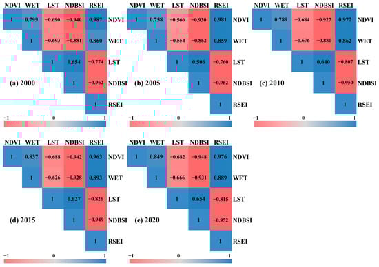 Some scholars replace component indicators with alternative indicators to construct new RSEI models to monitor EEQ in specific areas (arid deserts, alpine regions, and so on). In the case of the YB, however, its vast area and diverse geological and geomorphological types make it difficult to find suitable component indexes. Moreover, creating new indicators through substituting component indicators [38] appears to introduce more subjectivity and challenges in the consistent application of the model. The effectiveness of the initial RSEI model has been demonstrated in different settings [39], leading to its application in monitoring EEQ in the YB. The average correlation coefficients of RSEI with NDVI, WET, LST, and NDBSI are 0.9758, 0.8726, −0.7964, and −0.9550, as shown in Figure 12, further validating the comprehensive representativeness of RSEI.