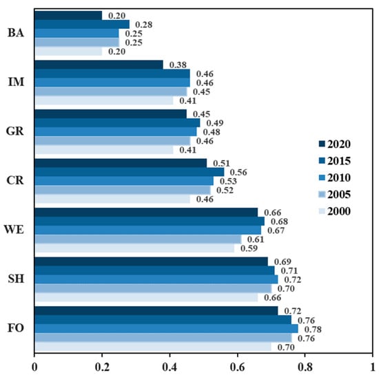 Land cover is an important factor affecting the spatial differentiation of RSEI (Section 4.2). The distribution characteristics of RSEI differ significantly among different land cover types, and EEQ improvement or degradation areas tend to occur in areas where land type conversion occurs (Section 4.1). A comparative experiment was conducted to further explore the relationship between land cover types and RSEI. Figure 13 shows that the order of EEQ of different land cover types from high to low was forest, shrub, wetland, cropland, grassland, impervious land, and barren land.