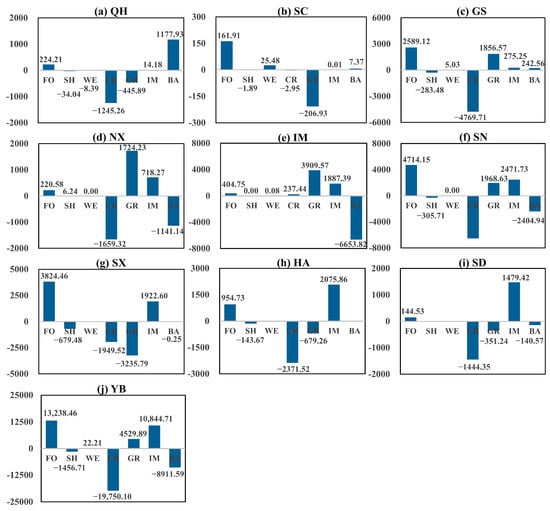 Area changes of different land cover types in the YB for the period 2000–2020 were calculated (Figure 14). During this period, the area of cropland and grassland in QH decreased, while the area of barren land increased by 1177.93 km2, and the grassland was severely degraded [42]. Problems with reduced grassland areas are also present in SC and GS. According to relevant studies, increased grassland degradation and areas of desertification have been caused by overgrazing in QH, SC, and GS [43], with the problem of grassland degradation remaining prominent. China’s prevention and control efforts regarding desertification have achieved a double reduction, in both desertification land and desertified land area. Indeed, the bare land areas of NX and IM reduced by 1141.14 km2 and 6653.82 km2, respectively, during the study period. A series of soil and water conservation measures, such as the comprehensive watershed management, the construction of the Three-North Shelterbelt, and the return of cropland to forest (grass), have partially improved the ecological status of the region. In addition, the ecological degradation of the YB is also related to the large-scale expansion of impervious surface, which has increased by 10,844.71 km2 in the past 20 years.