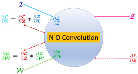 Computation of the loss gradients of ND convolutional layer. The loss gradient of the previous layer () is propagated to other layers via the help of local gradients (, ) and the chain rule.
