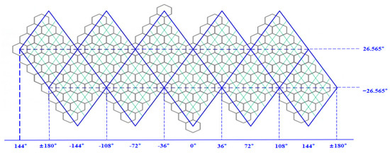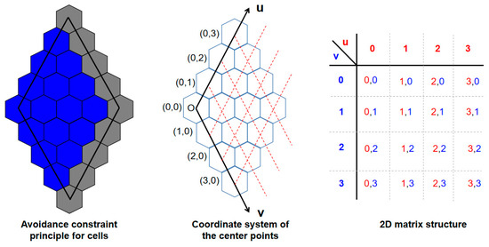 If the centroids of the hexagonal cells are used to identify the hexagonal cells, the hexagonal grid can be transformed into a regular 2D rectangular array on the basic rhombic surface, which can be regarded as a kind of rhombic tile structure, as shown in Figure 4.