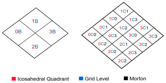Firstly, we encoded the rhombic tiles. From Section 4.1.1 of this paper, we know that the root nodes of the rhombic tiles are the ten basic rhombic surfaces of the icosahedron, which is a linear structure before the amount of data reaches the threshold, and a quadtree structure takes its place after the amount of data reaches the threshold. According to this characteristic, we defined a rhombic tile indexing method based on space-filling curves. The first byte of the code was , meaning the decimal form of the basic rhombus surface number, coded in the range 0–9, with the north and south poles denoted using N and S, respectively. The second byte was , meaning the level of the grid, and, in order to avoid too many bits occupied by the level encoding, we used the thirty-sixth decimal form, ranged 0–36. The subsequent bytes were S, meaning the encoding based on the space-filling curve, which served to uniquely identify the subtiles obtained from the quadtree cut, as shown in Table 1.