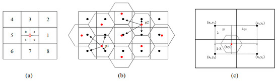 Principle of bilinear interpolation of raster data: (a) Principle of bilinear interpolation; (b) Finding the nearest raster point from the center of a hexagonal cell; (c) Interpolate the center of the hexagonal cell based on the coordinates of the four nearest raster center points.