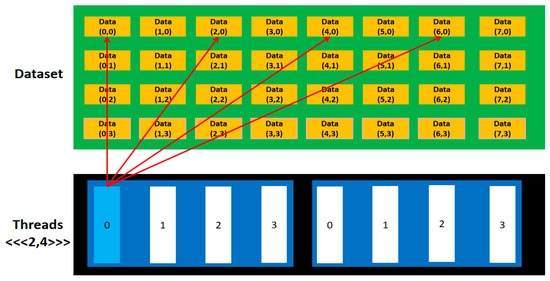 In this research, the raster data resampling algorithm is applied in the GPU in order to avoid the performance problem caused by transferring arrays larger than the maximum number of threads to the GPU in high-resolution raster integration. To be exact, this research adopts the method of mesh grid–stride loops (GSLs) to execute the resampling of raster data in the CUDA. During the data solving process, the grid–stride loop is implemented in the entire threaded grid by means of the jump traversal of the one-dimensional data array by one grid width at a time, that is, by creating a loop which takes the thread grid through the entire array, in which case, each thread must move to the next unprocessed location after one loop iteration. If one were to suppose that there were two grids in a thread, with four blocks in each grid, the grid–stride loops would be executed as shown in Figure 12.