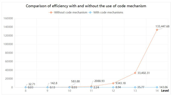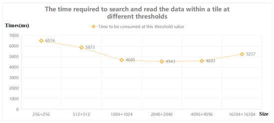 It can be seen from the experimental results that the segmentation threshold of tile data is closely related to the search and scheduling efficiency of the raster data. If the threshold is too small, it will greatly increase the number of operations for retrieval and scheduling, which will affect the efficiency of data indexing. On the other hand, if the threshold is too large, it will increase the amount of transmission per raster data block, causing an increase in the time for raster data to be read. The experiments show that the IO efficiency of the raster data reaches the highest value when 2048 × 2048 hexagonal cells are decoded in each rhombic tile, at which time the grid level is 11. Therefore, the threshold M in Section 4.1 of this paper is 11.