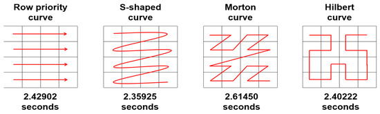 Though the scheduling strategy between individual tile data and raster data has been determined in Section 4.2.1 of this paper, but, for the full tile data, traversal through space-filling curves is still required. Therefore, the impact of different common space-filling curves on the efficiency of the algorithm has to be evaluated. The raster data used for the evaluation are the global Aster 30 m digital elevation data, which correspond to tiles with a level of 18. The evaluation method is to traverse the same tile data point based on different space-filling curves and record the raster data that are scheduled in each tile data. After completing the traversal, the average number of times that each raster data point is scheduled in the traversal process is counted. The experimental results are shown in Figure 15.