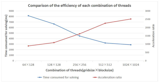 When CUDA is executed, the Kernel function in the Host program is executed on the GPU according to the concept of grid (thread grid). A Kernel function corresponds to a grid. When a task is to be executed, the grid assigns the task to part of a block (thread block), which contains multiple threads, and the block assigns the task to different threads in it and performs concurrent computations. In order to achieve the highest degree of concurrency, it is necessary to conduct experiments to find out the best sizes of block and grid that are conducive to the highest efficiency. Therefore, in this paper, “gridsize” denotes the size of the grid, and “blocksize” denotes the size of the block in CUDA. We conducted a comparison experiment on the computation efficiency for different combinations of gridsize blocksize, and the experimental results are shown in Figure 16.