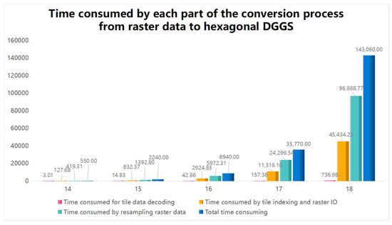 Based on the above experiments, the optimal combination scheme of the algorithm in an NVIDIA GeForce RTX 2060 graphics card can be derived: that is, each rhombic tile can be decoded in the GPU to obtain 2048 × 2048 hexagonal cells, on the basis of which the scheduling of grid data is achieved using the S-shaped space-filling curve, and the combination of the grid and the block is defined as 256 × 256 in CUDA. The time consumed by each part of the process of GPU-based transmission from raster data to the hexagonal DGGS using the above parameters is shown in Figure 18, and the x-axis is the level of tiles.