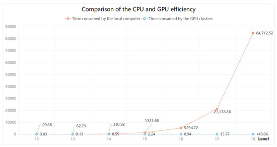 Based on this scheme, a comparison of the overall efficiency between the proposed algorithm and the traditional CPU-based raster data integration algorithm is conducted. The CPU-based integration algorithm uses hexagonal connectivity maps [20], and the comparison results are shown in Figure 19.