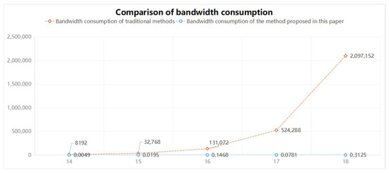 In this paper, the rhombic tile structure is used as a texture to realize the transmission of DGGS data from the CPU to the GPU, and the coding and decoding mechanisms are specially designed for this structure. Specifically, the hexagonal cells and the rhombic tiles are encoded in the CPU, and then only the encoding is transferred to the GPU, where the data are decoded, thus reducing the PCI-e bandwidth consumption during data transfer. Assume that the concurrency of data transmission is 200 requests per second and that the data volume includes all the rhombic tiles. Figure 20 illustrates the comparison of data transmission bandwidth requirements with and without the rhombic tile structure in the data organization phase of the hexagonal DGGS. Figure 21 illustrates the overall efficiency comparison with and without the proposed encoding and decoding methods.