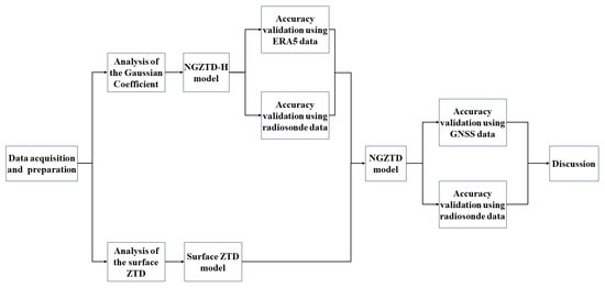 China is characterized by greatly undulating terrain, large latitudinal spans, various climate types, and large diurnal atmospheric differences [35,36,37]. Under such conditions, the ZTD exhibits complex variations in both time and space. Existing ZTD models have difficulty meeting the requirements of applications in China with the aforementioned characteristics. Therefore, a detailed investigation of the spatiotemporal variations of the ZTD and the selection of better functions are of considerable significance for applications in GNSS and InSAR. Our aim was to develop a NGZTD model that considers the time-varying vertical adjustment and delicate diurnal variations of ZTD. To attain this objective, this paper is organized as follows. Section 2 introduces the data and methods for calculating ZTD and analyzes the spatiotemporal characteristics of Gaussian coefficients and surface ZTD. Section 3 develops a NGZTD-H model to vertically adjust ZTD, and the vertical interpolation accuracy of the model is validated using ERA5 and radiosonde data. In addition, the NGZTD model is developed to directly calculate ZTD, and its accuracy is validated using GNSS and radiosonde data. Section 4 discusses the main error sources of the NGZTD model. Section 5 contains the Conclusions. The research framework is shown in Figure 1. The proposed model compensates for the limitations of existing ZTD models in China. The new model is expected to be applied to precise point positioning (PPP) and InSAR atmospheric correction to improve their monitoring accuracy.