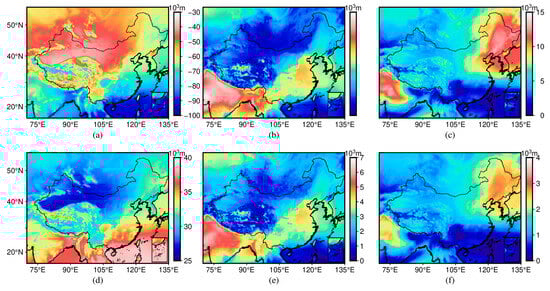 Analyzing the temporal variation characteristics of the Gaussian coefficients b and c is critical for developing a ZTD vertical adjustment model. Therefore, the annual mean values and amplitudes of Gaussian coefficients b and c were calculated using the ERA5 ZTD to analyze the distribution characteristics of Gaussian coefficients b and c over China. The results are shown in Figure 2. To calculate these values, the ZTD-layered profiles calculated using ERA5 atmospheric reanalysis data from 2014 to 2017 were fitted using Equation (5) to obtain b and c for all grid points. Second, the Gaussian coefficients b and c for each grid point were fitted by considering the annual and semi-annual periods using Equation (6) [20]. Finally, the annual mean values and amplitudes of Gaussian coefficients b and c were obtained using Equations (7) and (8).