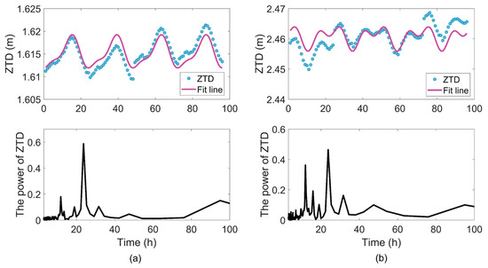Analyzing the delicate temporal variations of ZTD contributes to the provision of important references for optimizing the ZTD model. The surface ZTD has significant annual and semi-annual periods [34]. Two representative grid points in China were selected to determine the diurnal and semi-diurnal periods by adopting the fast Fourier transform.