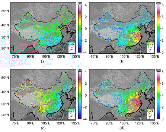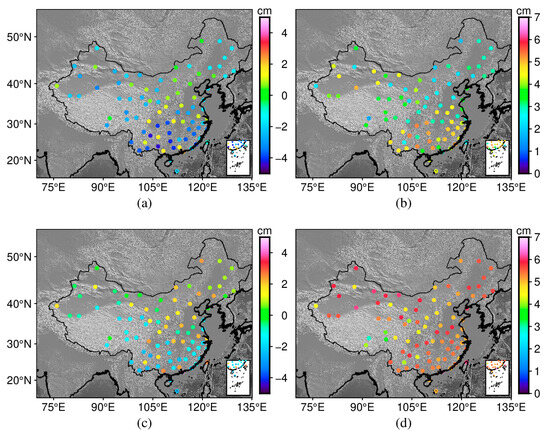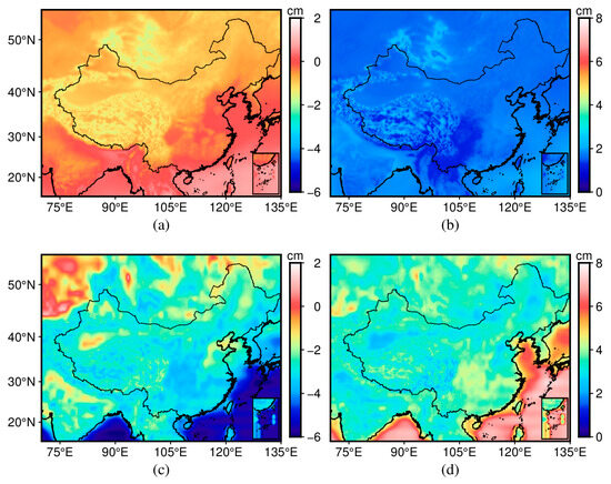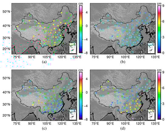 Figure 15 shows the stable results for NGZTD-H model at each GNSS station in China. Its bias was approximately 0 cm in most regions and reached −3 cm at individual stations in Southwest China, which indicated that the model struggles to express the vertical variation of ZTD in these regions. However, the result of the GPT3 model shows a large negative bias in most regions. The RMSE of the NGZTD-H model was smaller at high latitudes. However, the RMSE of the GPT3 model was greater than 2 cm at most GNSS stations. Therefore, compared with the GPT3 model, the NGZTD-H model has better stability in spatial interpolation.