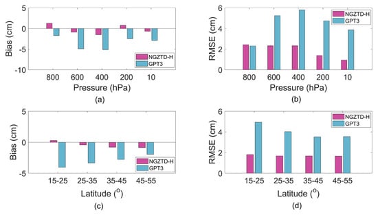 As shown in Figure 6, the NGZTD-H model exhibited a small bias value in all pressure layers, positive values in two pressure layers at 800 and 200 hPa, and a negative value in the rest of the pressure layers, which were all approximately 0 cm. The GPT3 model exhibited a large value in all pressure layers; the value reached −5 cm in the pressure layers with 600 and 400 hPa. The bias of the GPT3 model was negative in all pressure layers, indicating a negative systematic error. Moreover, the RMSE of the NGZTD-H model was approximately 2 cm for all the pressure layers. It attained a better performance in 200 and 10 hPa pressure layers, which indicated that the NGZTD-H model is more precise at larger vertical interpolation heights. However, the GPT3 model exhibited larger errors in most pressure layers, with an RMSE of approximately 5 cm. In addition, the bias of the NGZTD-H model was within 1 cm for all latitude bands. The bias of the GPT3 model reached −4 cm at lower latitudes. This finding may be due to the variations of meteorological parameters in the troposphere being more complicated at low latitudes, which causes difficulties in capturing their variations using the GPT3 model. The bias of the GPT3 model also showed a decreasing trend with increasing latitude. Additionally, The NGZTD-H model exhibited good stability in all latitude bands, and its RMSE ranged from 1.5 to 2 cm. The RMSE of the GPT3 model reached 5 cm at lower latitudes. Therefore, compared with the GPT3 model, the NGZTD-H model is more suitable for the vertical adjustment of the ZTD over China.