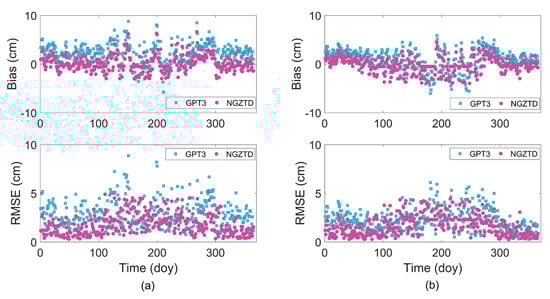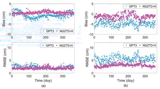 To investigate the adaptability of the NGZTD-H model to seasonal variation, the diurnal mean bias and RMSE were determined at two representative radiosonde stations (Hailar and Hangzhou). As shown in Figure 8, at the Hailar radiosonde station, the GPT3 model, which had poor seasonal adaptation, was seriously affected by seasonal variations, and its bias fluctuated throughout the year. However, the NGZTD-H model could resist the influence of the season on the vertical adjustment of the ZTD, and its bias was stable throughout the year. The RMSE of the new model was 2 cm. At the Hangzhou radiosonde station, two models exhibited fluctuations. The bias of the NGZTD-H model fluctuated at approximately 0 cm, and its RMSE was approximately 2 cm. However, the GPT3 model exhibited a more evident negative bias. Therefore, the NGZTD-H model is more suitable for capturing seasonal variations than the GPT3 model.
